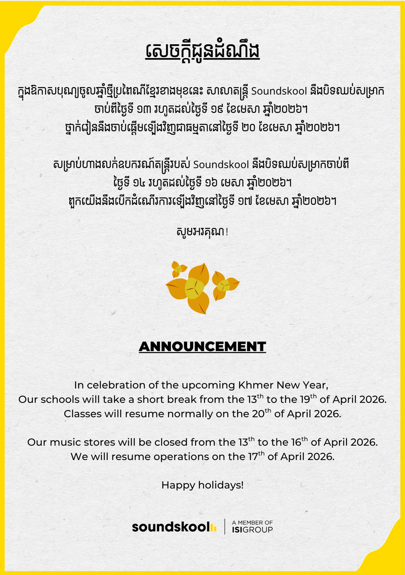 See the announcement for the closure dates of all Soundskool campuses and stores during the Khmer New Year holiday.