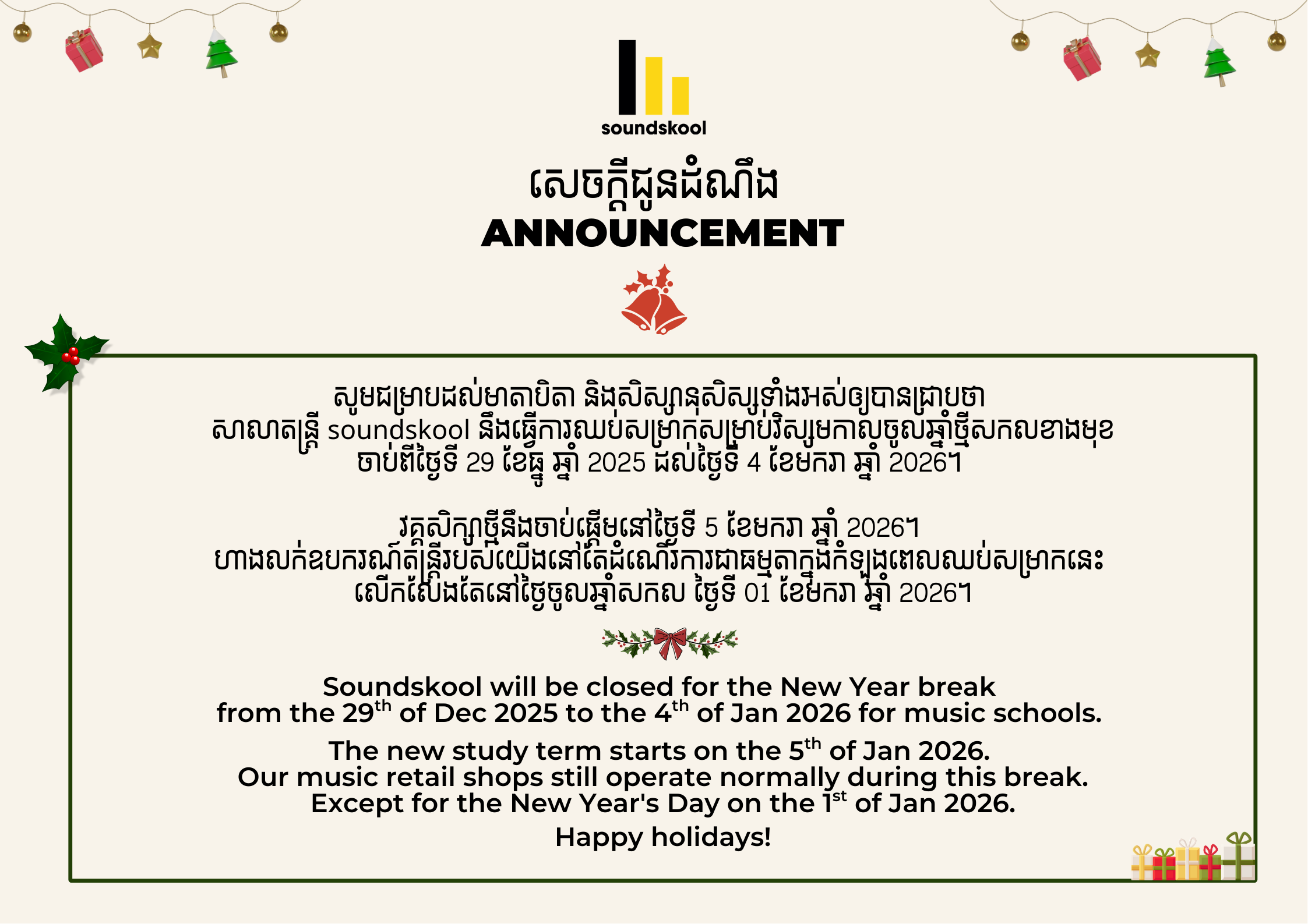 Soundskool campuses will be closed for the holidays from 29 December 2025 to 4th January 2026. Classes resume on the 5th of January 2026 for the new study term.