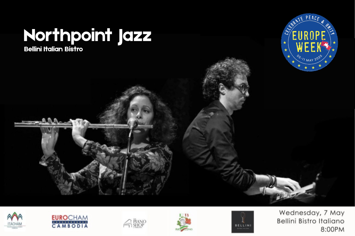 As part of Europe Week 2025, join us for an unforgettable evening of contemporary jazz with Northpoint, a jazz ensemble influenced by world music. Experience an intimate performance by Marie Coquillart (flute/vocals) and Jérémie Coquillart (piano) in a beautiful jazz-style dining setup.