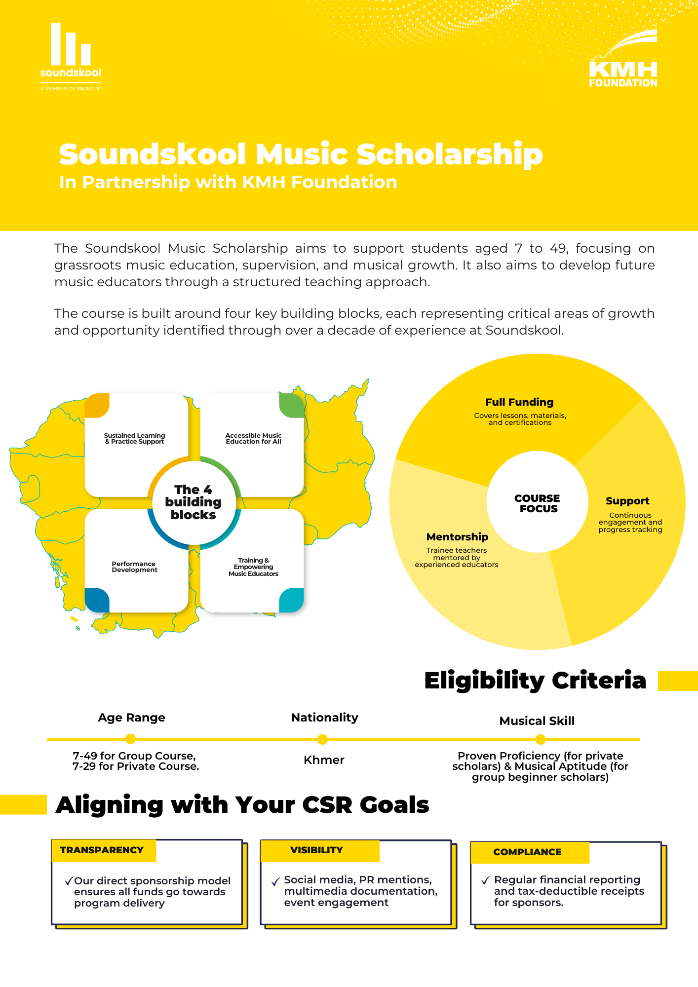 Through this collaboration, Soundskool and the KMH Foundation are launching comprehensive music scholarship programs to support talented Khmer students. The MoU establishes a strong framework for funding partners to engage in meaningful CSR initiatives, with a focus on families, education, youth, the arts, and music development.