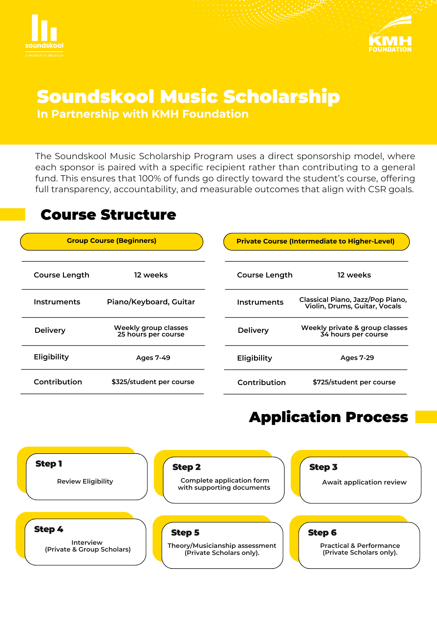 With the support of external corporate and individual sponsors, this partnership provides full scholarships that cover tuition, learning materials, supervised practice, and opportunities to perform publicly. This is where you can get involved!