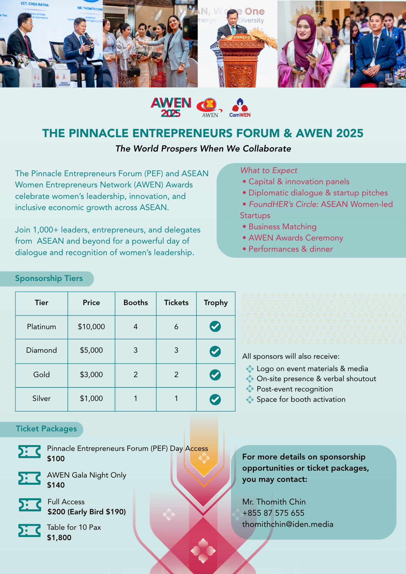 For more details on sponsorship opportunities or ticket packages, you may contact: Mr. Thomith Chin (tel: +855 87 575 655; email address: thomithchin@iden.media).
