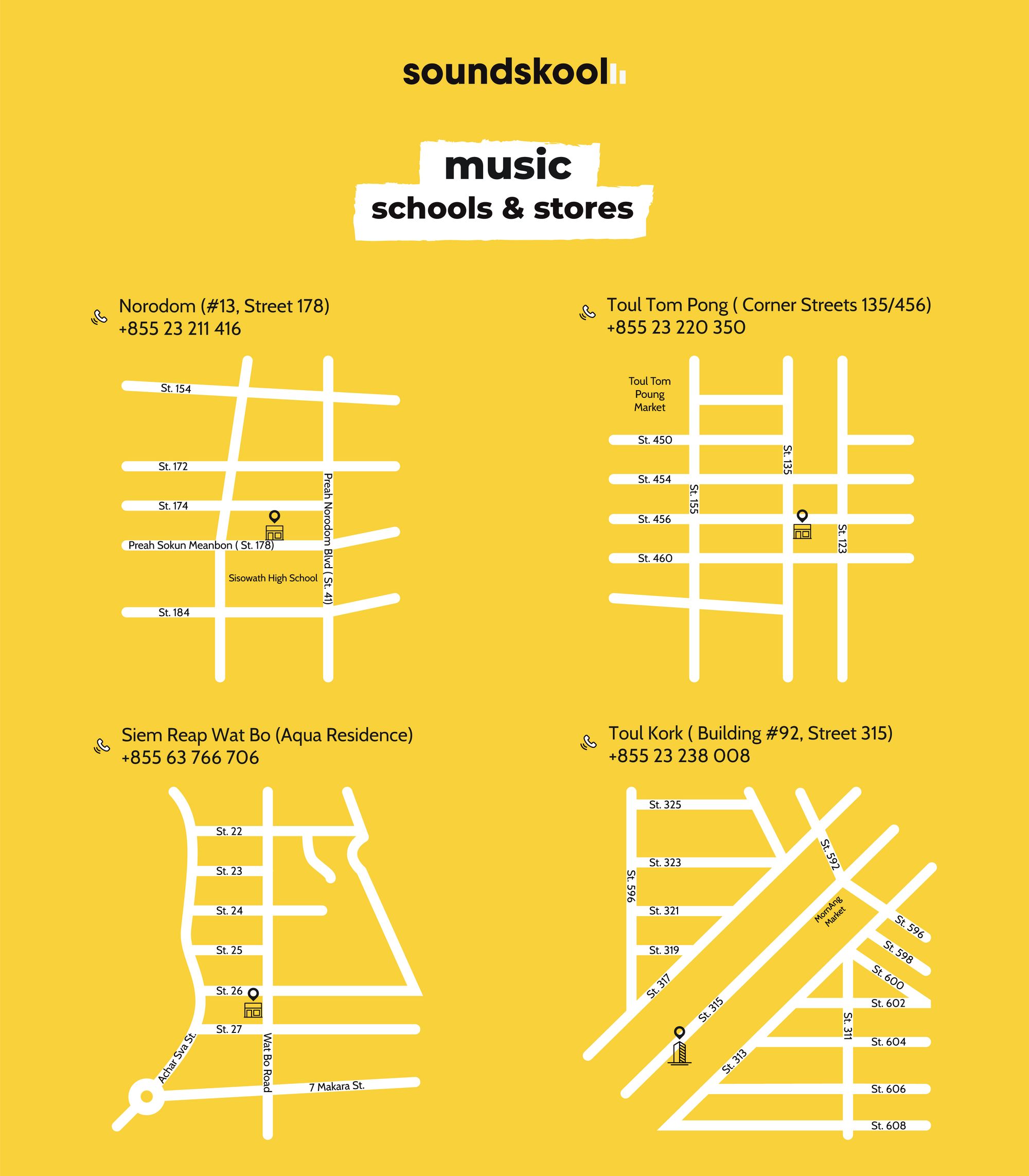 We are thrilled to announce the expansion of the Soundskool music school and store to Toul Kork, Phnom Penh, in addition to our Toul Tom Pong (Russian Market) and Norodom (Sisowat) branches. Our retail and school team are excited to welcome Toul Kork and clients safely in early September 2021.